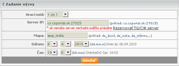 V prípade nevyplnenia políčka s IP adresou servera systém informuje o nezaobstaraní servera a server musí dodať prijímateľ výzvy. V nasledujúcom políčku vypĺňa vyzývateľ mapu, ktorá sa bude hrať. Posledné dve dôležité informácie sú dátum a čas ktorý sa navolí cez roletové menu.