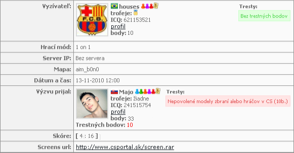 Po prijatí výzvy sa vám všetky potrebné informácie zobrazia na webe príslušnej výzvy. Hráči po odohratí duelu sú povinní priložiť url download linku na screeny a zadanie výsledku zápasu. Protesty a všetky iné záležitosti podávajú a riešie v samotných komentároch príslušnej výzvy. Administrátor skontroluje správnosť vložených údajov, poprípade vyrieši zadané protesty. Info udelených príčin trestov a body sa zobrazujú vedľa profilov hráča. Každý háč vidí svoje nazbierané trestné body ale celkové skóre bodov vidia všetci návštevníci webu. Informácie o počte zadaných, prijatých výzvach spolu so získanými skóre bodmi a trestnými bodmi nájdete vo svojom user profile.