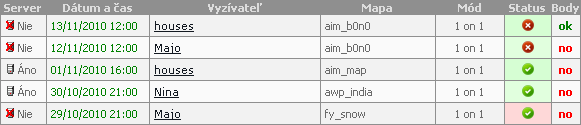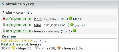 Aktuálne zadané výzvy nájdete v panely Aktuálne výzvy nachádzajúci sa v pravom hornom rohu webovej stránky. V tomto panely sú informácie o zadanej výzve vyzývateľom, ktoré pozostávajú zo statusu servera (má/nemá), dátumu a hodiny, nick hráča, mapa a buttonu na prijatie výzvy. Pod nimi sa nachádza odkaz na zoznam a pod ním v prihlásenom stave info o prijatých výzvach súperom (počet a hráč), vami prijaté výzvy (počet a hráč). V spodnej časti sa nachádza TOP3 hráčov s najlepším skóre z celej skupiny hráčov.