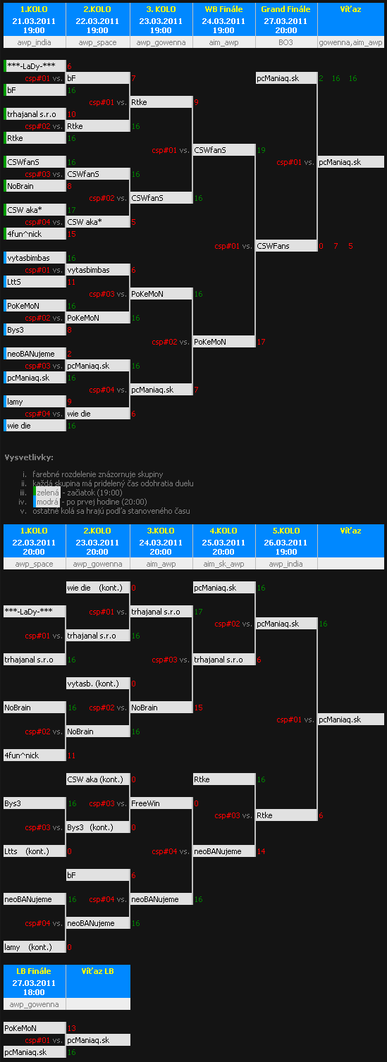 Rozpis tímov, časy zápasov a pridelený server nájdete v Turnaj menu pod odkazom Zápasy. Ďalej v menu nájdete Tabuľku tímov, Registráciu, Pravidlá. Pre registrovaných budú sprístupnené ďalšie dve ponuky Výsledky a Žiadosti. Tieto dva odkazy sú zobrazené len pre adminov a zúčastnených hráčov. Každý hráč musí vedieť pravidlá turnaja. Neznalosť pravidiel sa neospravedlňuje.