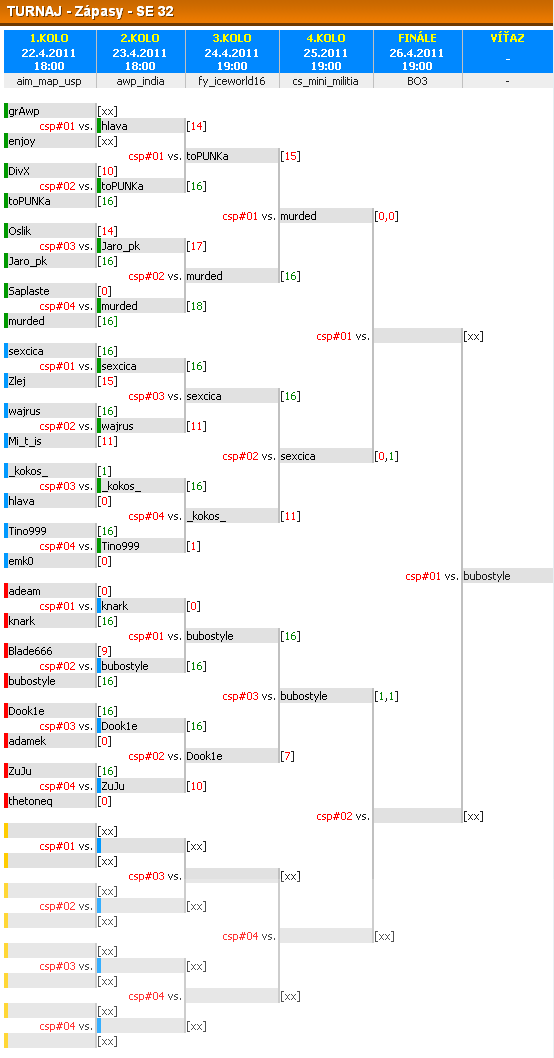 Rozpis tímov, časy zápasov a pridelený server nájdete v Turnaj menu pod odkazom Zápasy. Ďalej v menu nájdete Tabuľku hráčov, Registráciu, Pravidlá. Pre registrovaných budú sprístupnené ďalšie dve ponuky Výsledky a Žiadosti. Tieto dva odkazy sú zobrazené len pre adminov a zúčastnených hráčov. Každý hráč musí vedieť pravidlá turnaja. Neznalosť pravidiel sa neospravedlňuje!