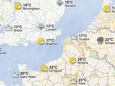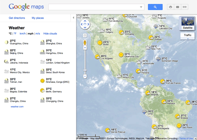 Ak chcete pridať počasie vrstvu, postačí prejsť myšou nad widget v pravom hornom rohu Google Maps a vyberte počasie vrstvu zo zoznamu možností. Pri oddialení sa zobrazí mapa s aktuálnym počasím zo servera weather.com na rôznych miestach, s ikonami naznačujúcimi slnko, mraky, dážď a tak ďalej.