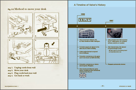 Táto príručka je pre širokú verejnosť, aby vedeli ako to u nich funguje pri nástupe nového zamestnanca. Obsah je veľmi široký, nájdete tu veľa vecí ohľadom štýlu práce, ako pracujú jednotlivci, skupiny ľudí. Taktiež tu nájdete aj veľa vecí ohľadom toho ako dlho pracujú, taktiež sú tu aj popísané detaily toho ako funguje model riadenia, kto pod kým pracuje, kto pracuje samostatne, kto si je sám sebe pánom, aj keď tým najvyšším je nám dobre známy Gabe Newell. Príručka je veľmi zaujímavá, môžete sa aj pobaviť. Kto má záujem prejdite na Link