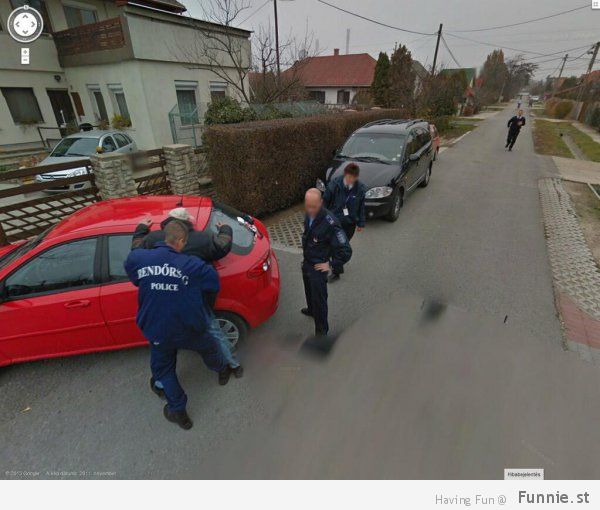 Na tomto obrázku zachytenom z Google Street View sa predviedla Maďarská polícia zatykajúca chlapíka pri červenom aute.