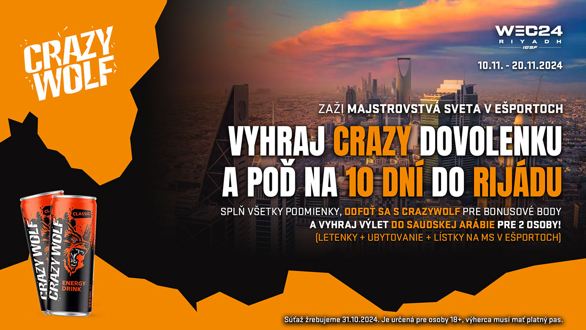Zaži atmosféru svetového podujatia a uži si 10-dňovú dovolenku v Rijáde – zapoj sa do jedinečnej súťaže, ktorú ti prináša CrazyWolf a YGames. Na Instagram profiloch YGames a Kaufland Slovensko nájdeš súťažný post, v ktorom sa môžeš zapojiť do losovania. Hráš o 2 spiatočné letenky do Rijádu, ubytovanie pre 2 osoby v 4* hoteli a vstupenky na IESF World Esports Championship.