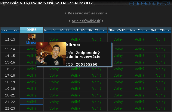Kliknutím na odkaz v menu Rezervácia TG/CW sa dostanete na podrobný rozpis obsadenosti servera. Tabuľka je rozčlenená na konkrétne časové pásmo a dni. Ak sa v danej bunke nachádza zeleným Voľný je jasné, že pre daný deň a časové pásmo je server voľný. Políčko kde sa nachádza avatar a nick znázorňuje, ktorý admin pridelil rezerváciu na stanovený dátum a čas. Pri nájazde myšou sa vám zobrazí info, kde je uvedené ICQ pre kontakt admina. Ak už máme vybraný čas a deň klikneme nad rozpisom na odkaz Rezervovať server.