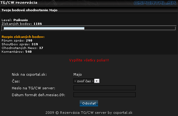 Následne sa dostaneme na rezervovací formulár. V prvej časti sa nachádzajú informácie o vami získaných bodoch, ktoré si popíšme nižšie. V druhej časti sa nachádza formulár v ktorom zvolíte časové pásmo odkedy dokedy. V druhom políčku Heslo na TG/CW server napíšete aké heslo chcete na server a v poslednom Dátum formát deň.mesiac.09 napíšete dátum podľa predpísaného formátu. Potom už len stačí objednávku odoslať.