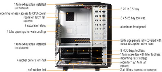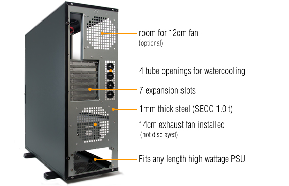 Na zadnom paneli sú tiež štyri otvory pre hadice vodného chladenia a priestor pre ďalší 12cm ventilátor.