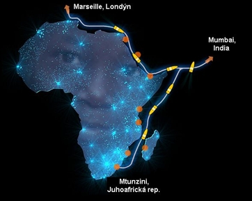 Indii (Mumbai).Podmorský optický kábel sa pripája na siete na pevnine v Johannesburgu (JAR),