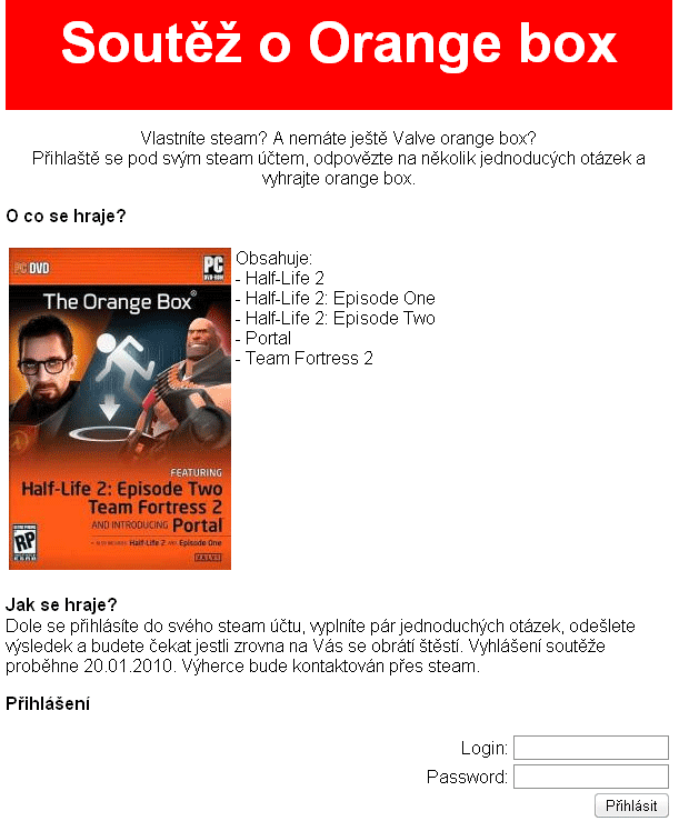 www.steam.unas.cz bola vytvorené len za jedným účelom a to nachytanie ľudí s podpriemerným IQ, ktorí sa zapoja do ich "súťaže". Táto súťaž je určená pre Steam userov a ponúka im výhru PC DVD The Orange Box.Ukážka webu: pre zväčšenie klikni na obrázok
