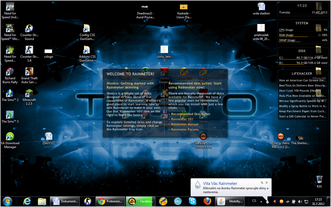 Našiel som jeden zaujímavý program, volá sa Rainmeter. Je to celkom jednoduchý program (až na niekoľko výnimiek) na skrášlenie plochy a na skrátenie času hľadania dôležitých informácií ako je napríklad rýchlosť internetu, miesta na diskoch , procesy procesora, miesto na pamäti ram alebo aj počasie.