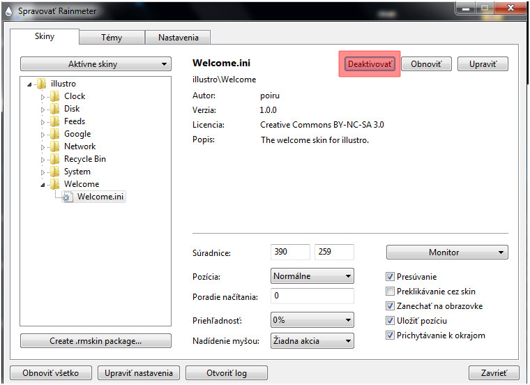 Spustíme si Rainmeter z lišty („Spravovať Rainmeter“). V okne spravovať Rainmeter si môžeme na klikať určitý „Skin“ a funkciou „Deaktivovať“ si môžeme skin zapnúť alebo vypnúť, nastaviť si súradnice na ploche, pozíciu, poradie pri načítavaním, priehľadnosť a mnoho dalšieho.