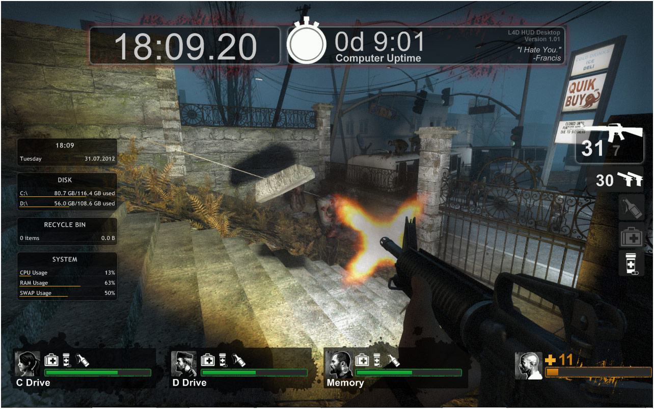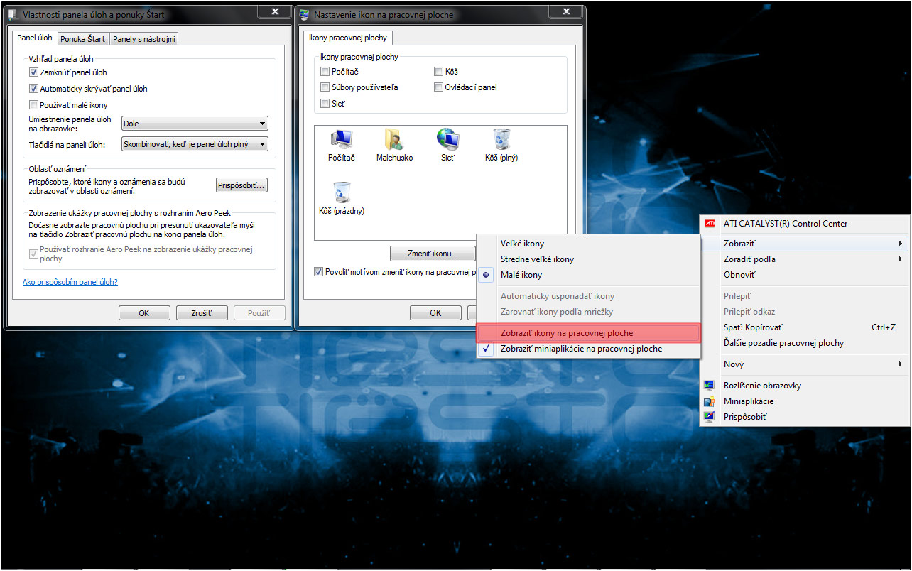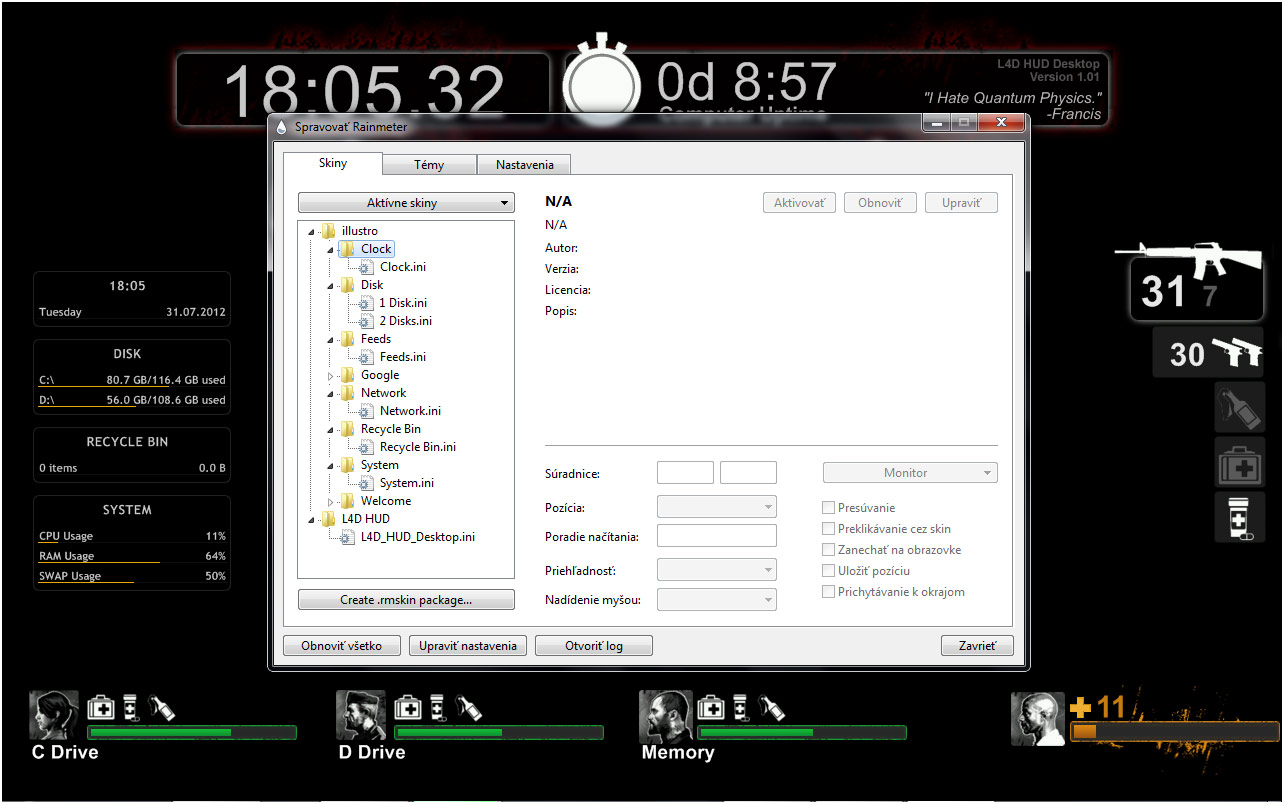 Tak Rainmeter + základné skiny máme ako tak zvládnuté, ide sa do finále. Stiahneme si nejaký „Skin“ zo stránky customize.org (Mne osobne sa páči „Skin“ L4D HUD). Zatiaľ čo sa nám sťahujú „Skiny“ tak si nastavíme plochu na príchod rainmetra. Klikneme pravím tlačítkom myši na plochu, potom „Zobraziť“ - „Zobraziť ikony na pracovnej ploche“ to od klikneme (skúšané na Win7 a Vista na XP neviem či táto možnosť existuje). Ako skryť kôs? Naťukáme si do vyhľadávacej lišty v štarte „Zobraziť alebo skryť bežné ikony na pracovnej ploche“ tam od klikneme všetko. Klikneme pravím tlačítkom myši na lištu „Štart“ – „Vlastnosti“ – od klikneme „Automaticky skrývať panel úloh“ . Teraz máme kompletne pripravenú plochu pre príchod Rainmetra.